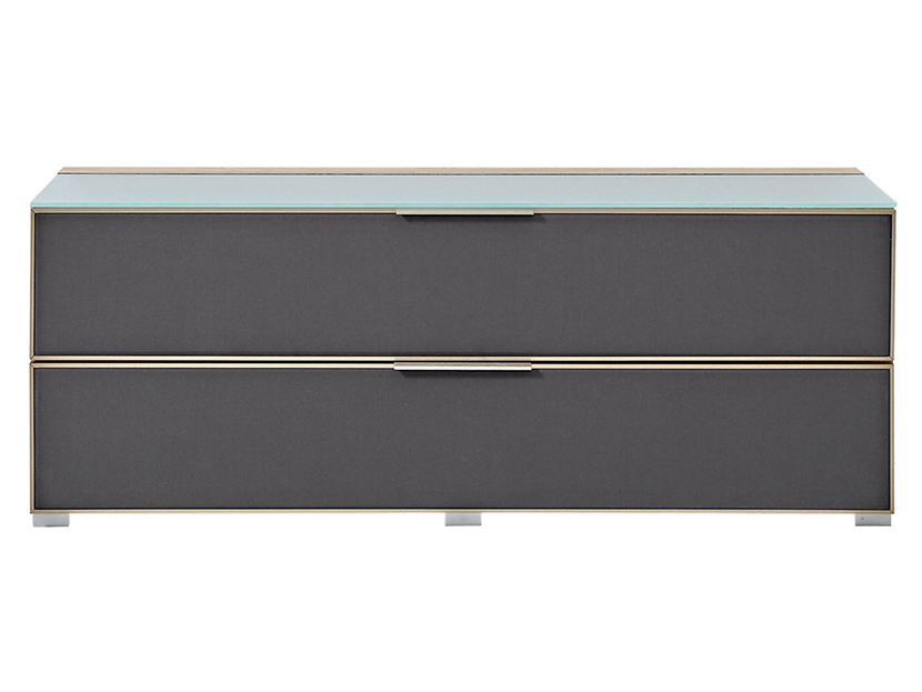 Nätt mediabänk i ekimitation med tyg på framsidan och topp i härdat glas. Två lådor som har mjukstängande funktion. LED belysning finns i bänken.