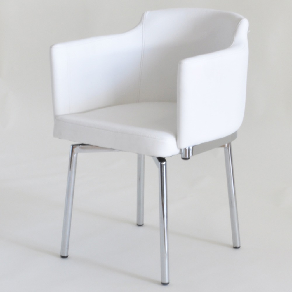 En snurrbar stol med armstöd, perfekt som matstol eller fåtölj. Material: Vitt konstläder och metall.