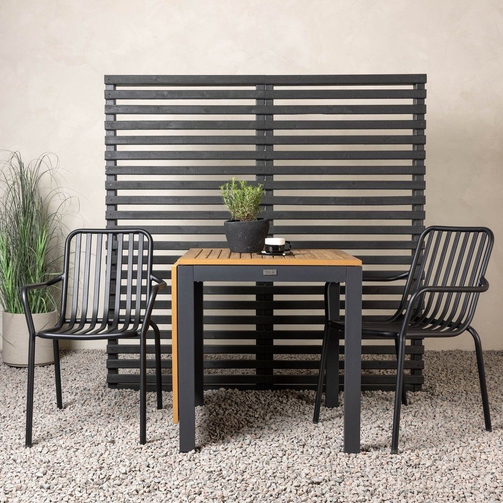 Charmig, praktisk och lättanpassad cafégrupp med alla rätt! Cafébordet Diego är lika smart som stilrent med en bordsskiva i brun Aintwood och ben i svart aluminium. Bordet har också enkel konstruktion som gör att du lätt fäller upp eller ner förlängningsskivor längs sidorna. Här i perfekt match med 2st svarta matstolar från serien Peking. Stolen är i svart aluminium, har ett ribbat utförande och integrerade armstöd för extra komfort! Här njuter du som mest av fikastunden! Bordets mått: 130/70x70cm.