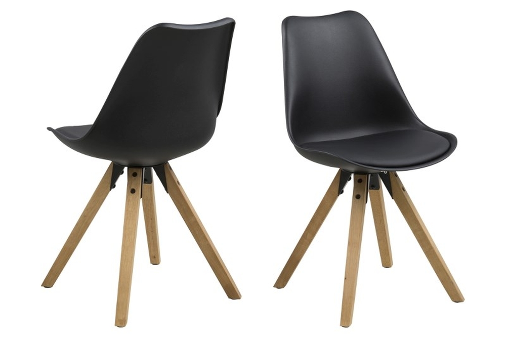 Stilig matstol från vår Dima serie med en rund modern design med benen är oljebehandlat gummi trä och själva sitsen är gjord i svart plast med en dyna som är klädd med svart konstläder (PU).