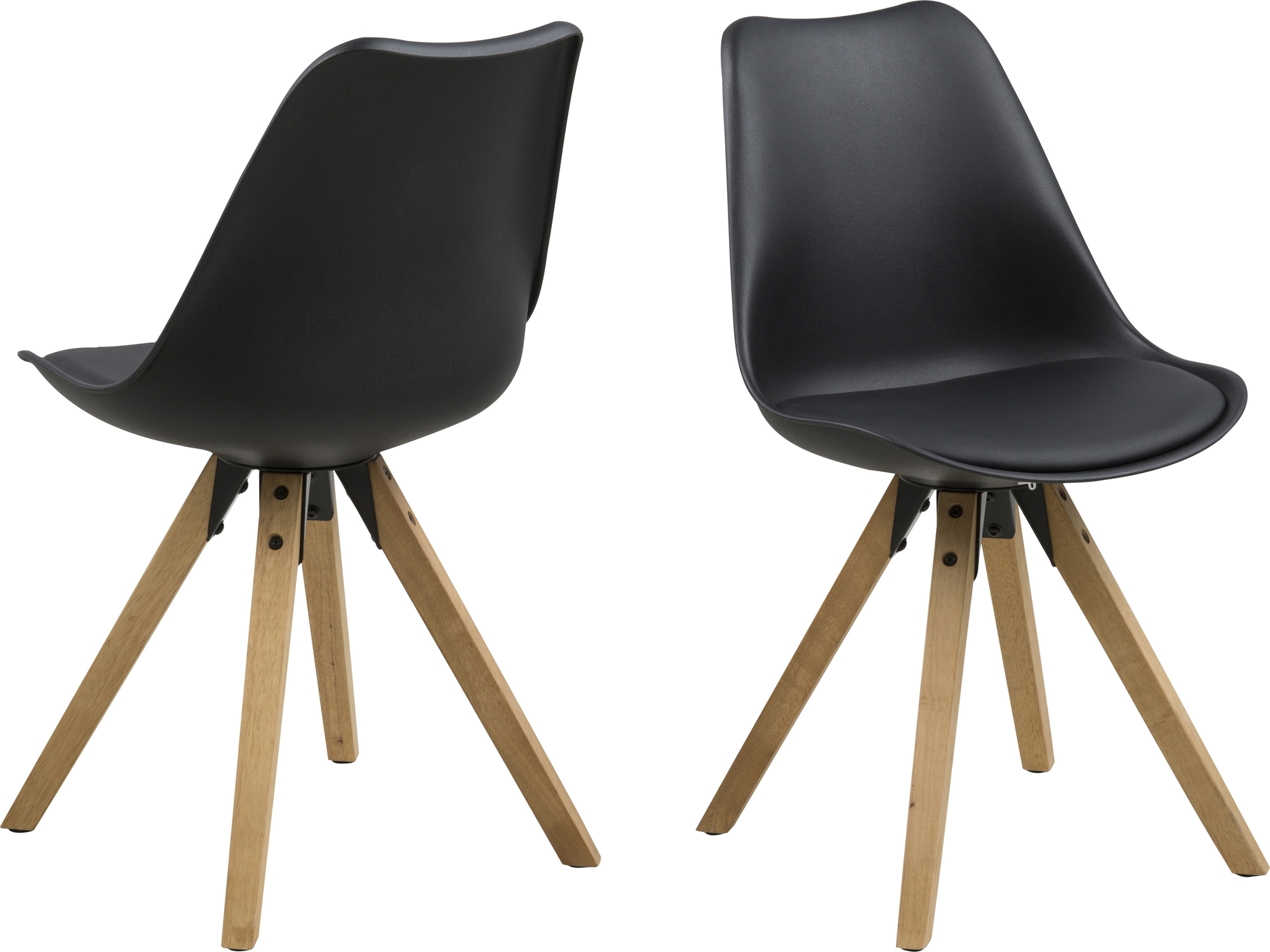 Matstol av polypropen med ben av lackerad gummiträ. Sits av PU-läder.