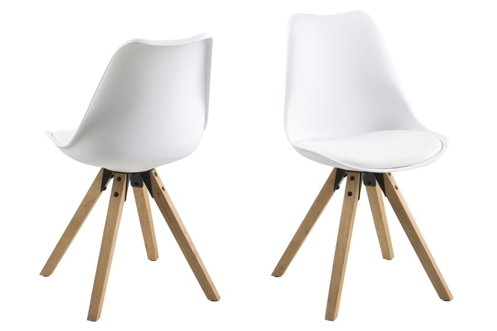 Stilig matstol från vår Dima serie med en rund modern design med benen är oljebehandlat gummi trä och själva sitsen är gjord i vit plast med en dyna som är klädd i vitt konstläder (PU).