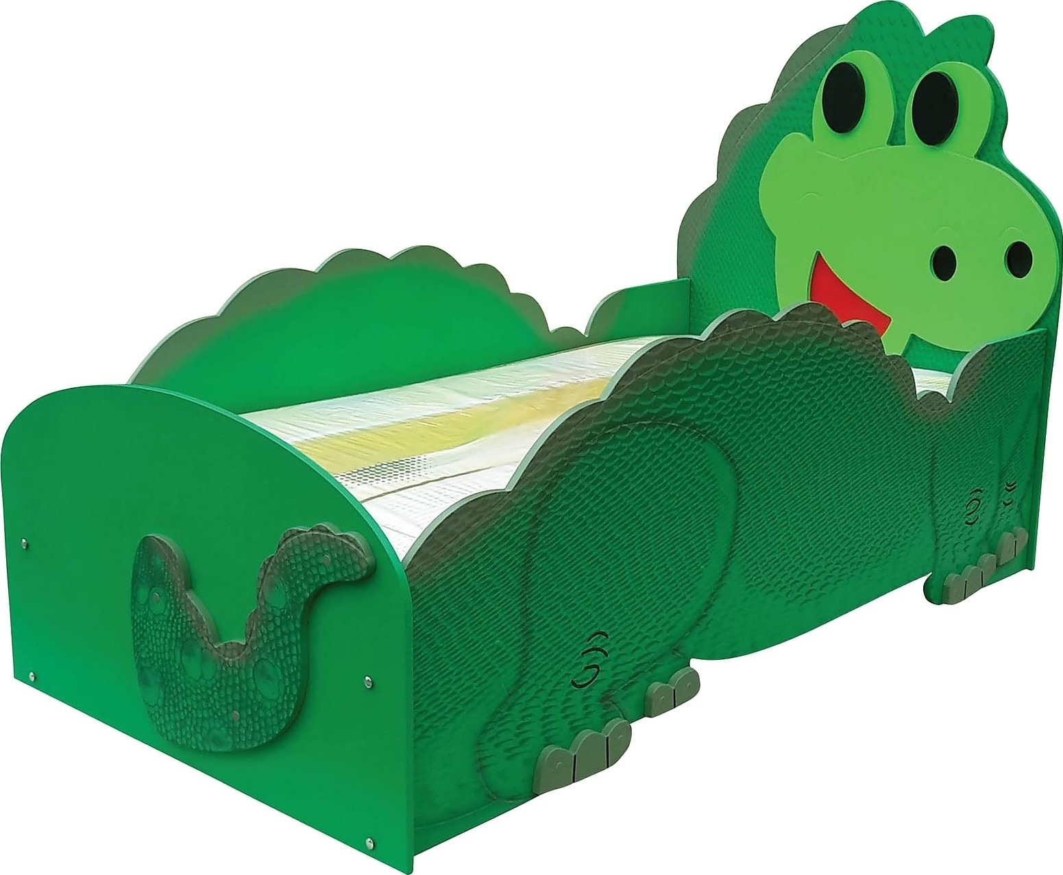 Söt grön säng med figur av en glad dinosaurie. Vem hade inte velat krypa ner till en snäll dinosaurie på kvällen? Sängen är gjord av MDF och har små fötter och svans. Madrass av bomull och polyester ingår.