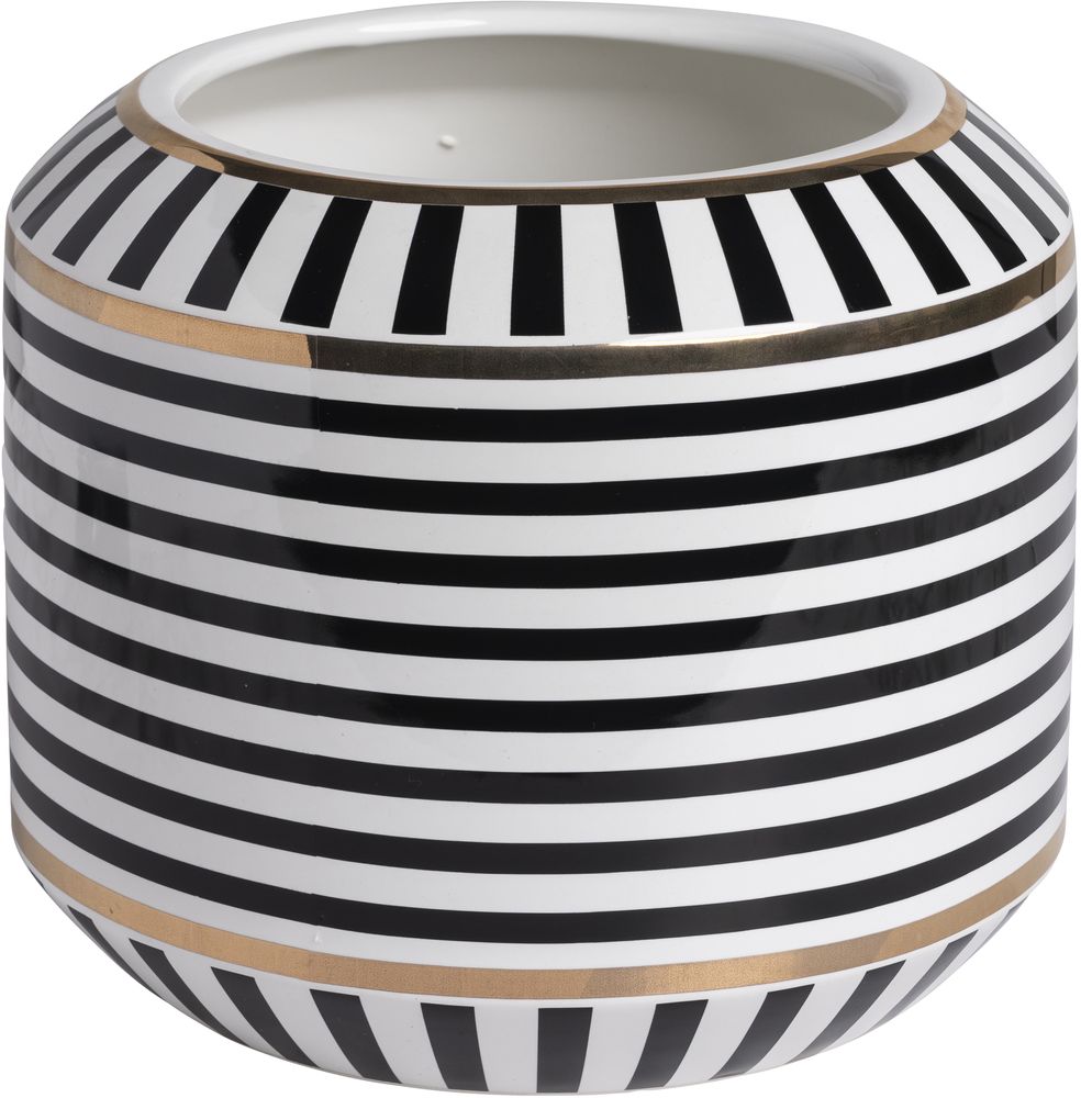 Vas av glaserad keramik med fina ränder i guld och svart.