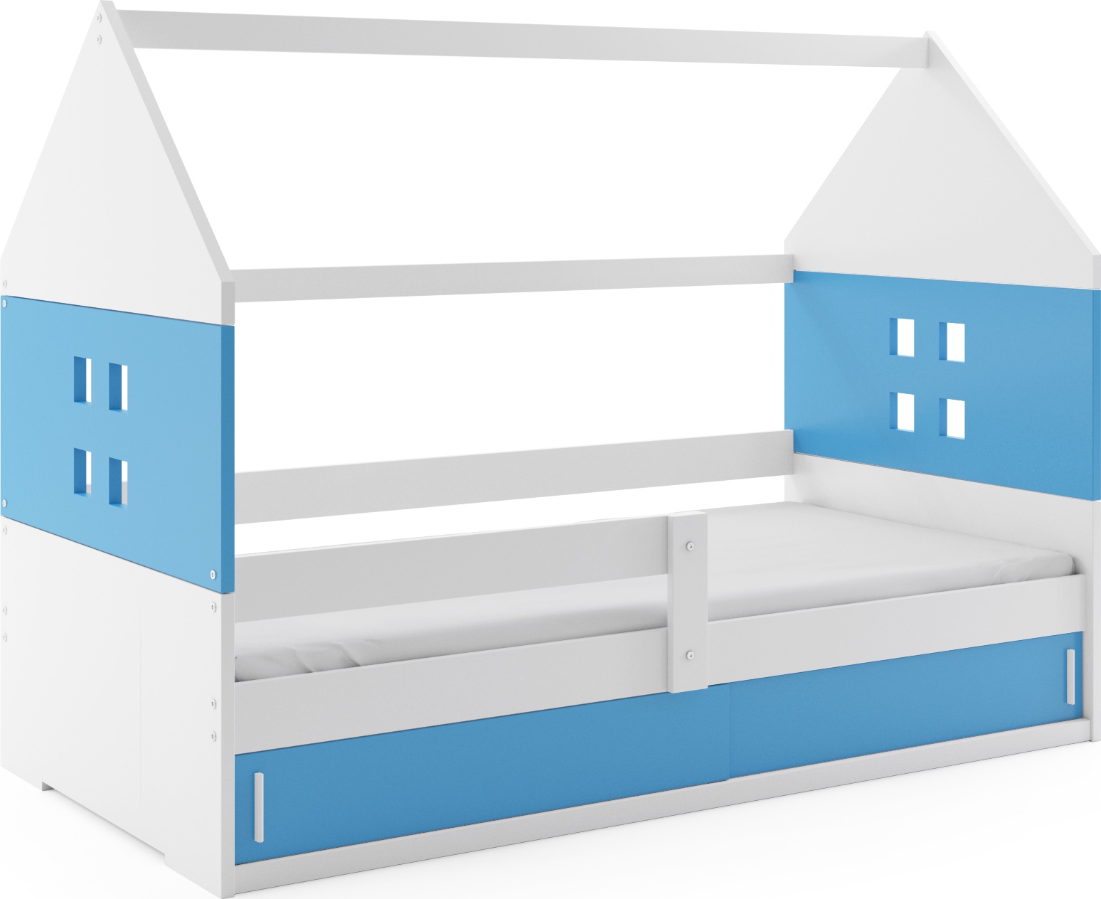 Säng med formen av ett hus med två balkar som kan användas till hängande inredningsdetaljer. Balkarna möjliggör även inklädning av ena sidan för att skapa en mysig inbäddad känsla. Sängen är byggd på en stomme i massiv furu med ribbor av björkträ som vilar på metallskenor. Sängen är lackad/målad med vattenbaserad allergivänlig lack/färg. Vid montering är placering av säkerhetsbarriären valfri och kan uteslutas helt. Madrassen av 7 cm:s polyuretanskum har ett överdrag av hypoallergent polyestertyg. Överdraget är försett med blixtlås och kan tas av för tvättning. Sängen levereras omonterad.