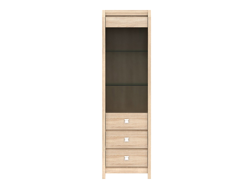 Ett fint vitrinskåp i ljus ek med dekorativa handtag. Vitrinskåpet har en glasdörr med praktiska hyllplan innanför och tre lådor som fungerar utmärkt för mindre förvaring.