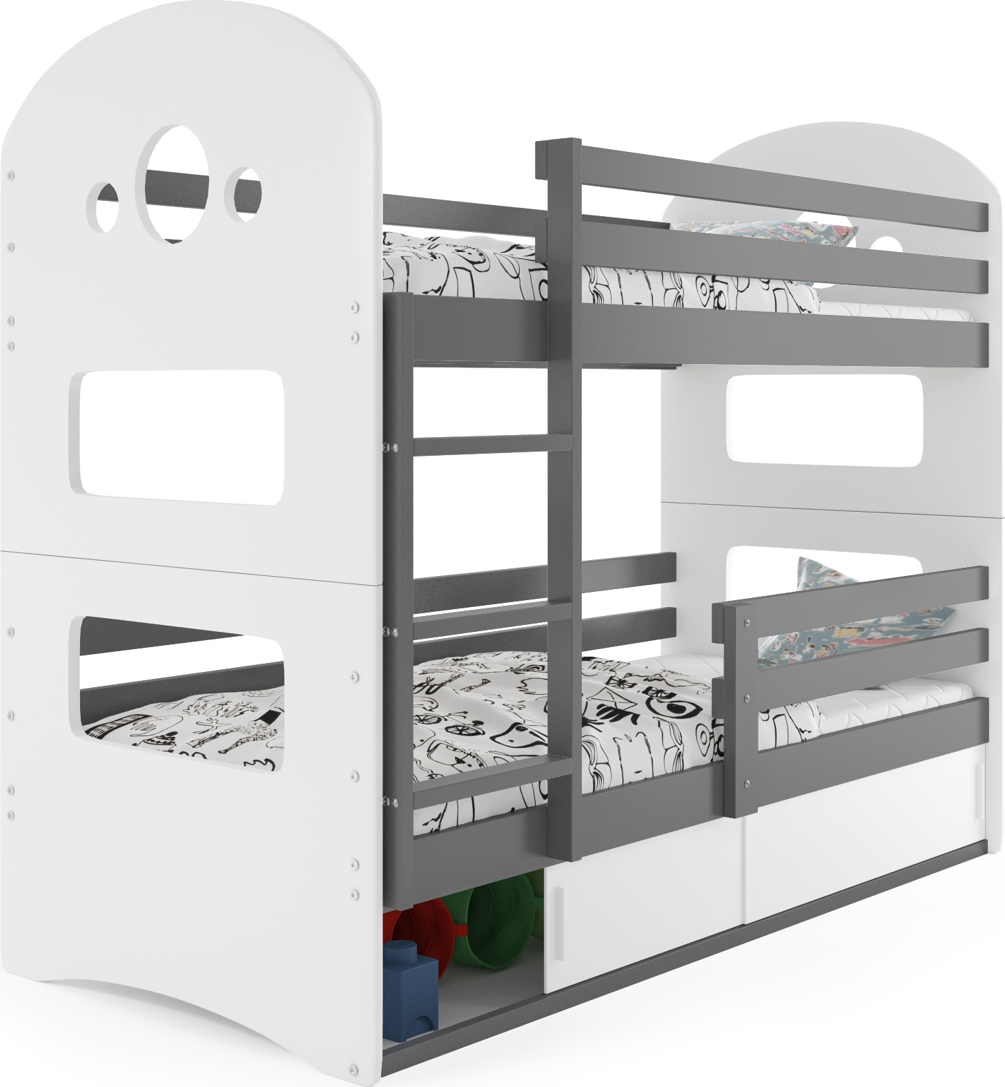 Våningssäng med förvaringsfack bakom skjutdörrar. Sängen är byggd på en stomme i massiv furu med ribbor av björkträ som vilar på metallskenor. Sidor och panel är av MDF. Sängen är lackad/målad med vattenbaserad allergivänlig lack/färg. Placering av säkerhetsbarriärer och stege är valfri och görs av kund vid montering. Madrasserna av 7 cm:s polyuretanskum har ett överdrag av hypoallergent polyestertyg. Överdraget är försett med blixtlås och kan tas av för tvättning. Sängen är tillverkad efter TÜV:s kvalitets- och säkerhetsstandard. Sängen levereras omonterad.