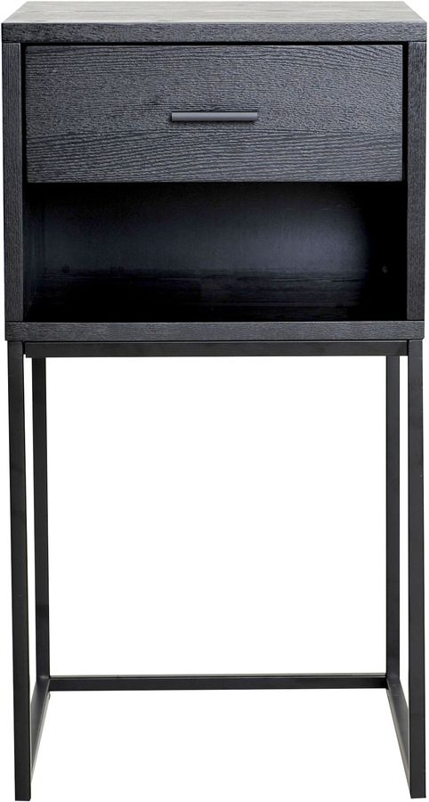 Sängbord med låda och hylla i svart askfaner och med svartlackerade metallben.