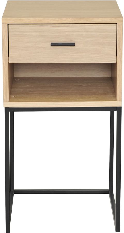 Sängbord med låda och hylla i vitpigmenterad ekfaner och underrede i svartlackerad metall.