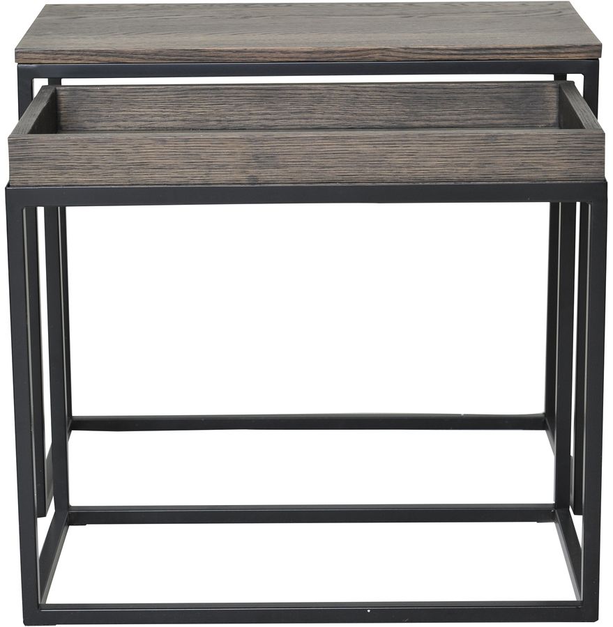 Set med sidobord i brun ekfaner, svartlackerade metallben. Toppen på det mindre bordet är vändbart.