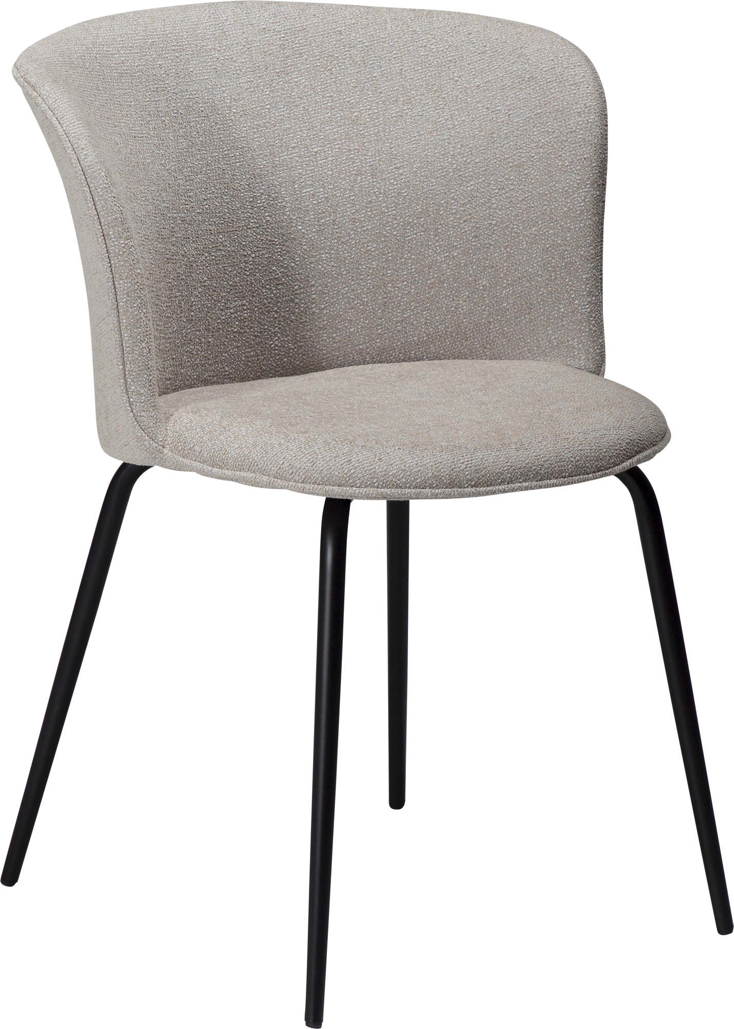 Ståtlig helklädd matstol med rundad rygg och smala koniska, metallben.