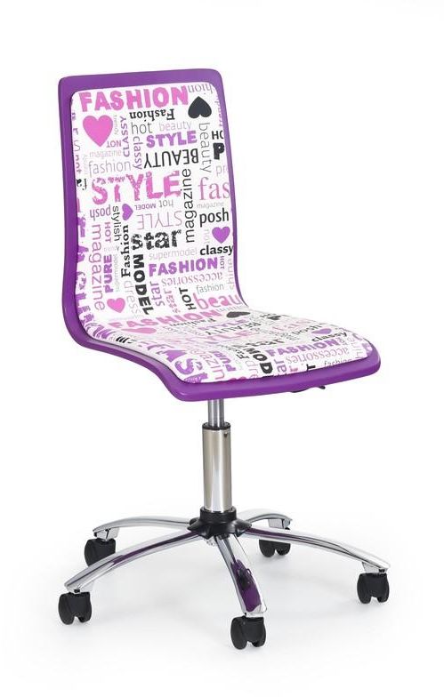 Ungdomlig skrivbordsstol med ett mysigt tryck på sitsen. Tillverkad i plywood med en behaglig klädsel i konstläder. Höj- och sänkbar sits och lätt att förflytta med hjälp av hjulen på den kromade stjärnfoten.