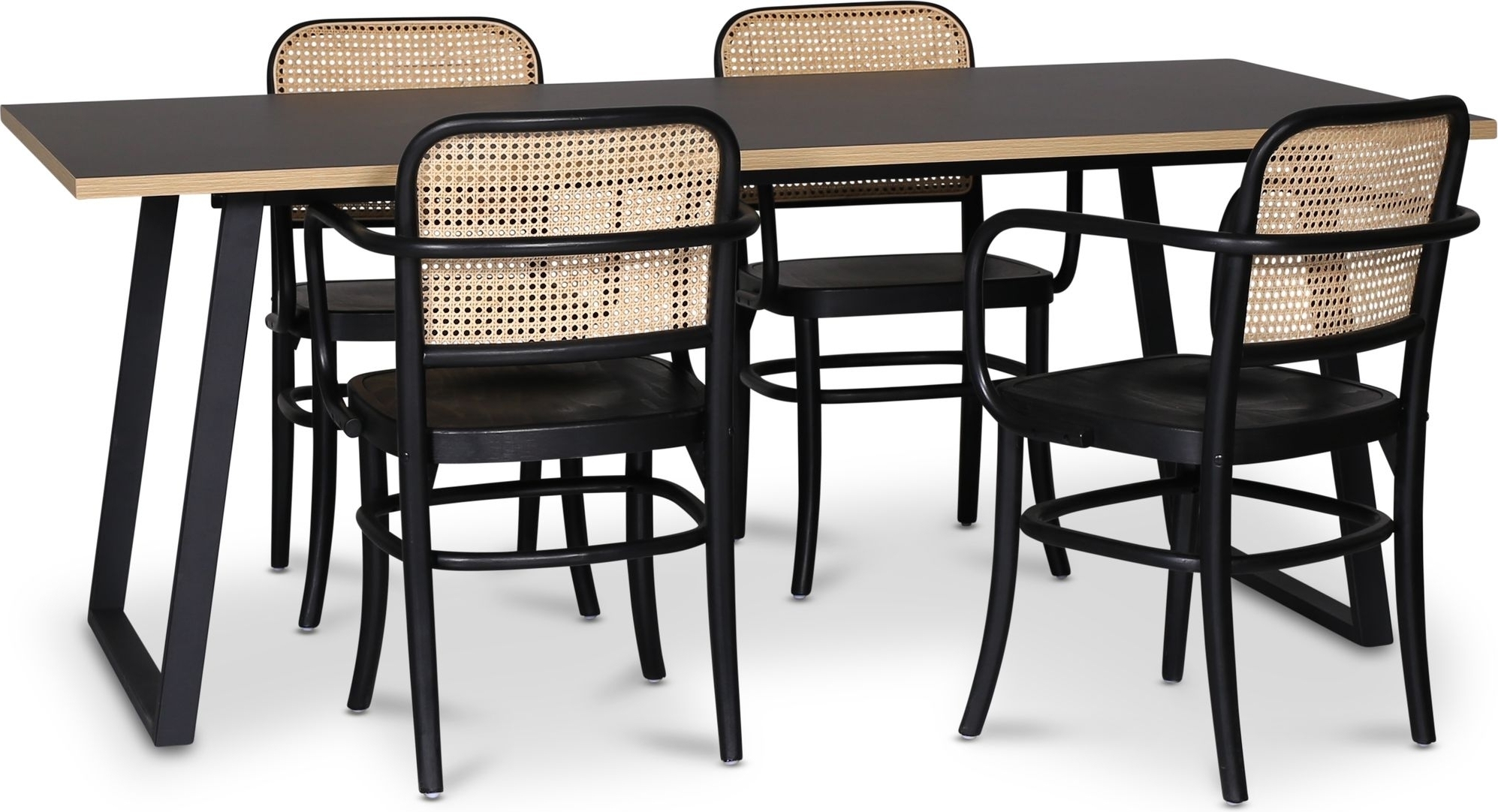 Inklusive 4 st karmstolar med svart stomme av böjträ, tillverkad av bok. Sits i trä och ryggstöd i naturfärgad rotting.
