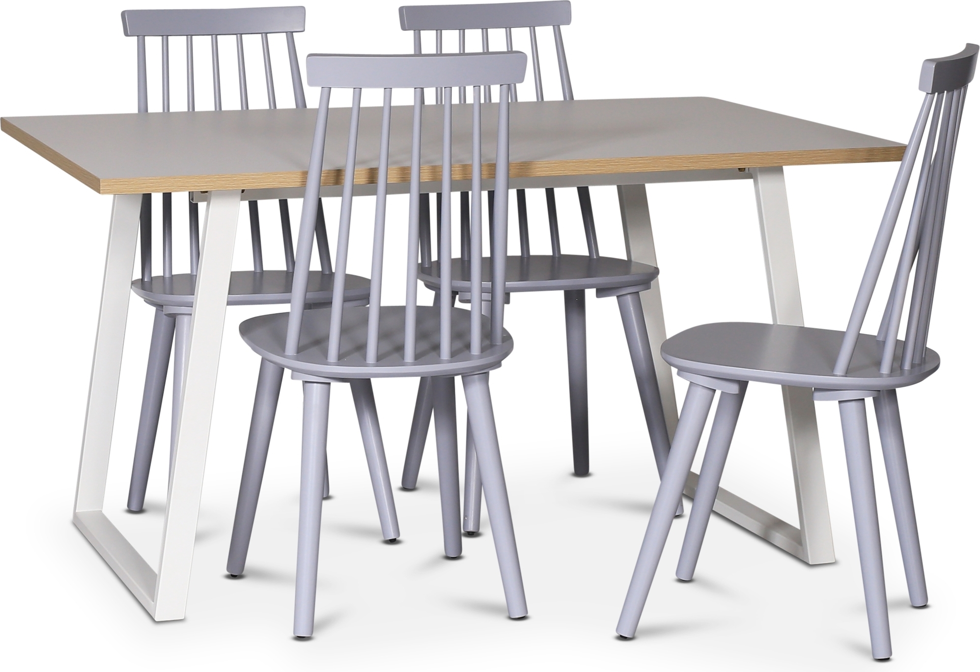 Edge matgrupp med 4 st stolar; Edge matbord 140x90 cm med vit högtryckslaminat som tål det mesta. Till detta medföljer 4 st matchande gråa Dalsland pinnstolar.