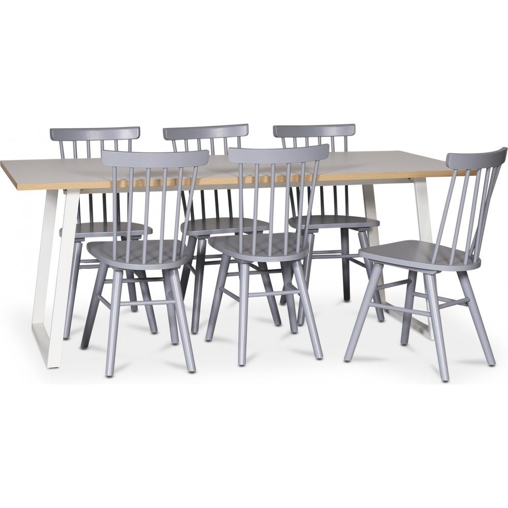 Edge matgrupp; Matbord i vit HPL 190x90 cm med 6 st gråa Orust pinnstolar