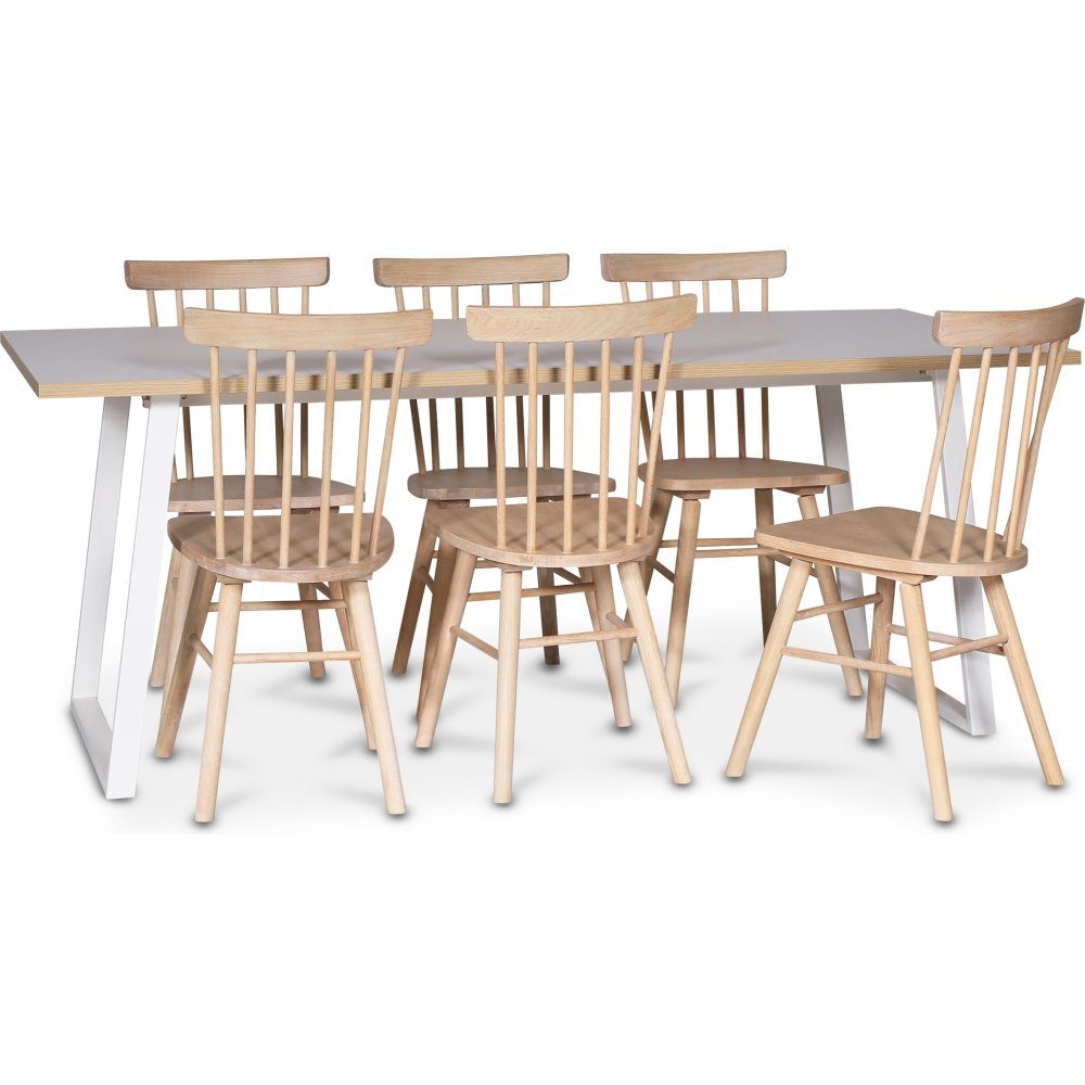 Edge matgrupp med 6 st stolar; Edge matbord 190x90 cm med vit högtryckslaminat som tål det mesta. Till detta medföljer 6 st matchande Orust pinnstolar i whitewash.