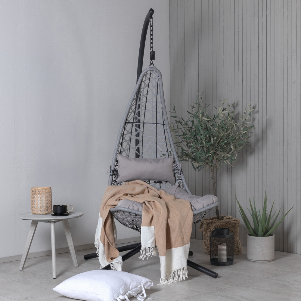 En riktig trendsättare ute på altanen eller i trädgården, eller varför inte vid poolkanten? Stolen har en sits i grå konstrotting och en ram i svart stål och matchande mjuka dynor som ingår. Plocka fram favoritboken och njut av sommarens lata dagar i hängstolen Edinburgh! Stolen finns i flera färger.