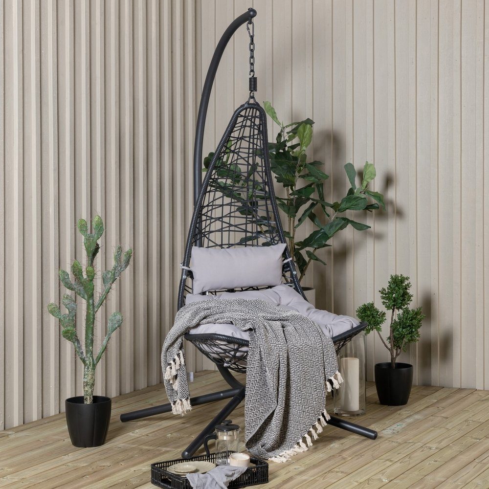 En riktig trendsättare ute på altanen eller i trädgården, eller varför inte vid poolkanten? Stolen har en sits i svart konstrotting och en ram i svart stål och matchande mjuka dynor som ingår. Plocka fram favoritboken och njut av sommarens lata dagar i hängstolen Edinburgh! Stolen finns i flera färger.