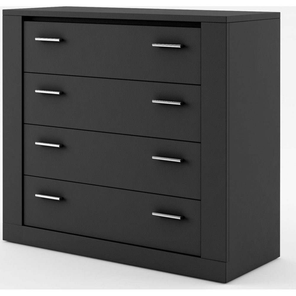Byrå av trä med 4 st lådor. Handtag av plast med matt finish. Levereras omonterad.