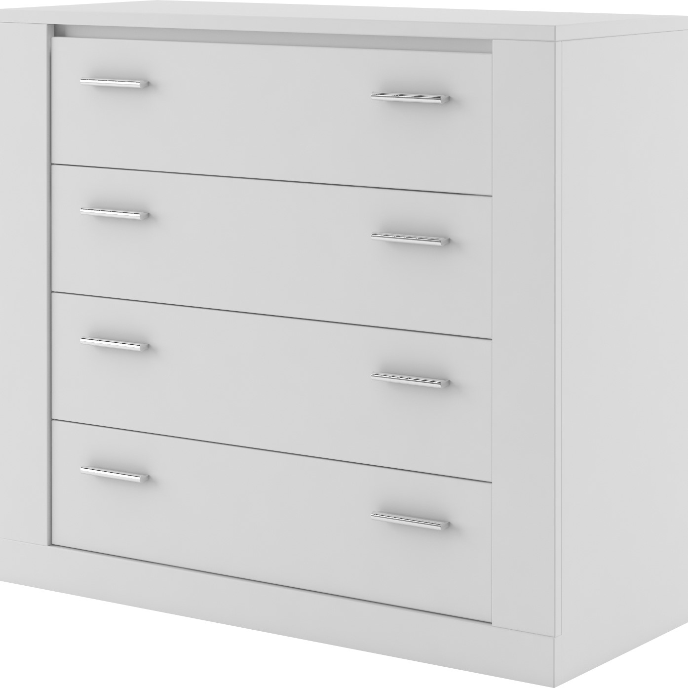 Byrå av trä med 4 st lådor. Handtag av plast med matt finish. Levereras omonterad.