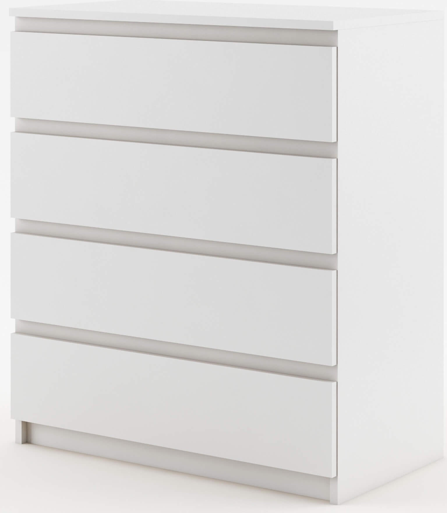 Byrå av spånskiva. Handtag av plast med matt finish. Levereras omonterad.