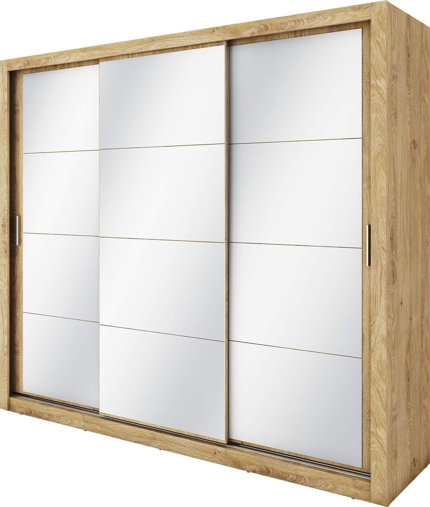 Garderob av trä med 3 st spegelförsedda skjutdörrar. Handtag av plast med matt finish. Levereras omonterad.