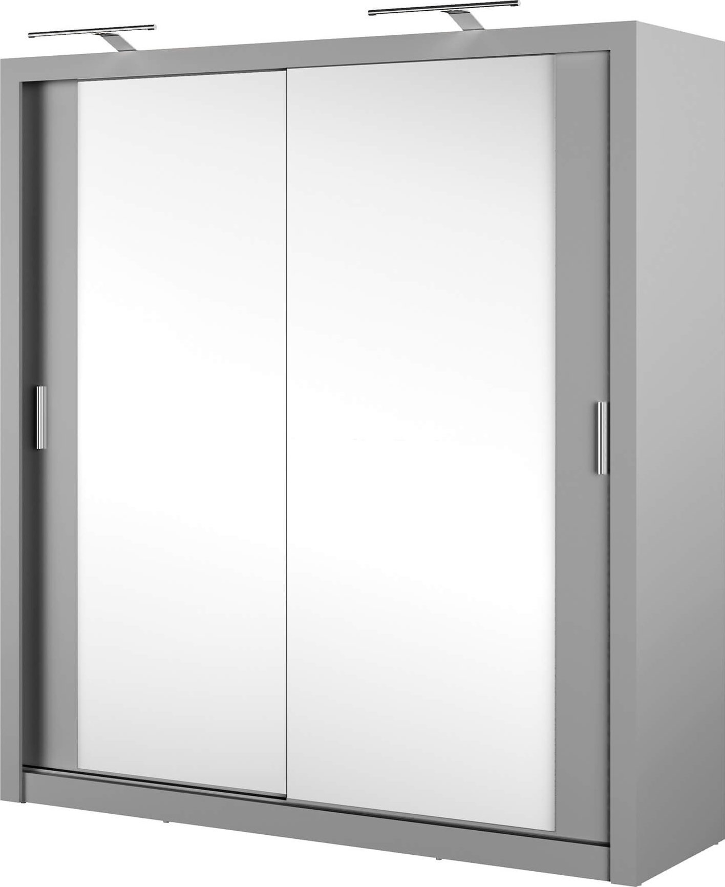 Garderob av trä med spegelförsedda skjutdörrar. LED-belysning ingår. Handtag av plast med matt finish. Levereras omonterad.