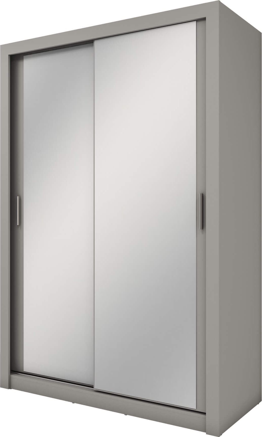 Garderob av trä med spegelförsedda skjutdörrar. Handtag av plast med matt finish. Levereras omonterad.