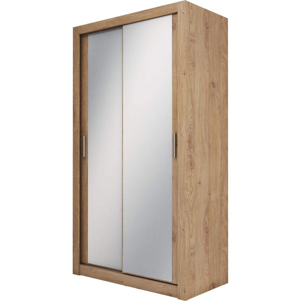 Garderob av trä med spegelförsedda skjutdörrar. Handtag av plast med matt finish. Levereras omonterad.