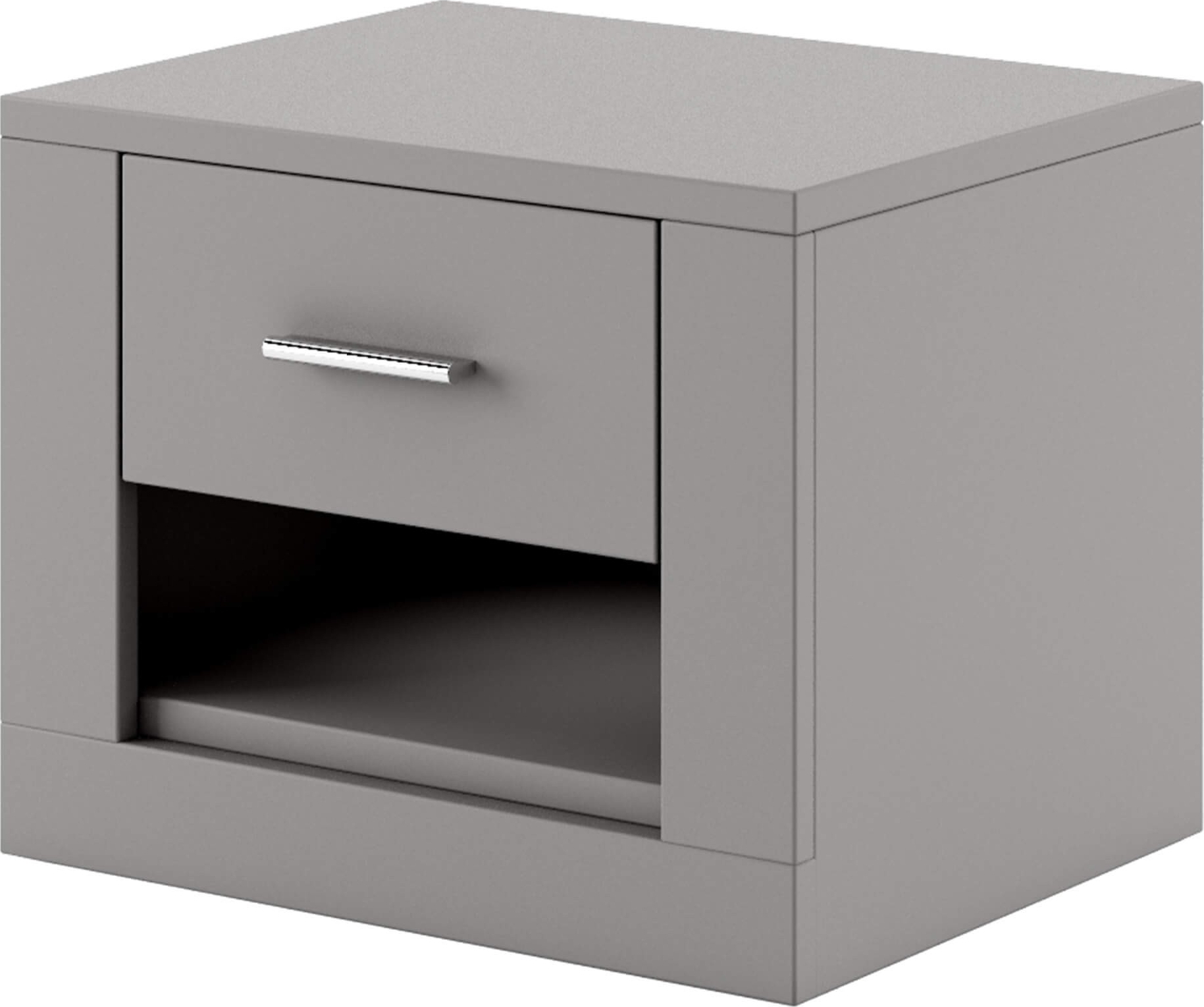 Sängbord av spånskiva. Handtag av plast med matt finish. Levereras omonterad.
