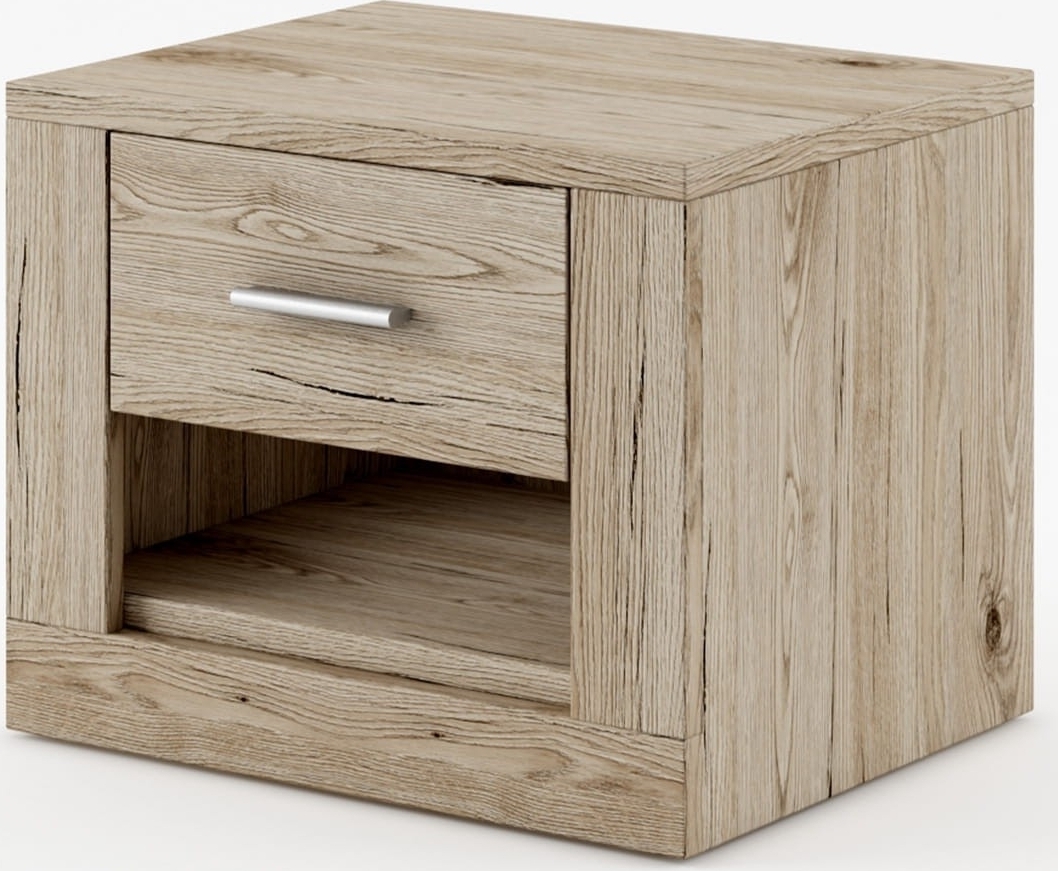 Sängbord av spånskiva. Handtag av plast med matt finish. Levereras omonterad.