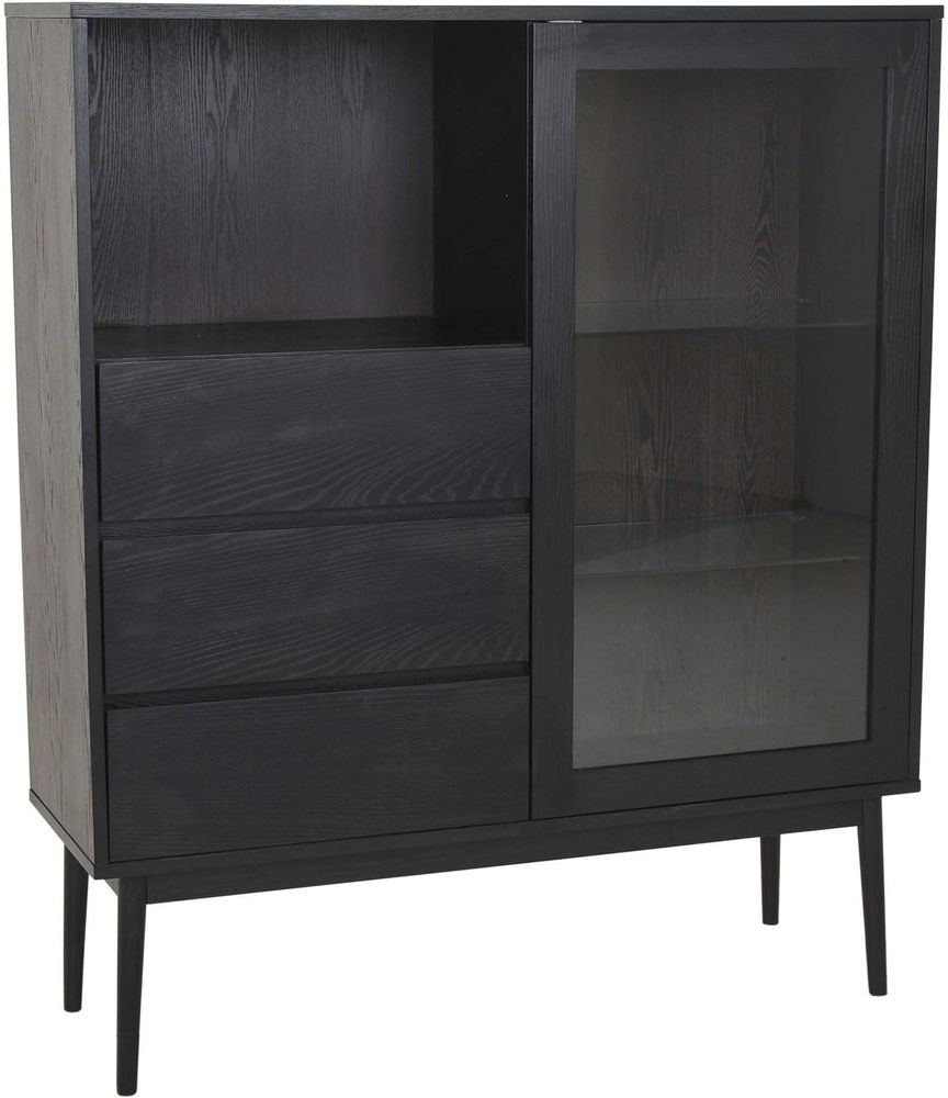 Ett snyggt skåp med en modern design. Tillverkad i MDF/trä med snyggt svartlackerat askfaner. Ett öppet hyllplan, tre lådor och ett skåp med hyllor för smart förvaring. Skåpsdörren har ett fönster i klarglas.