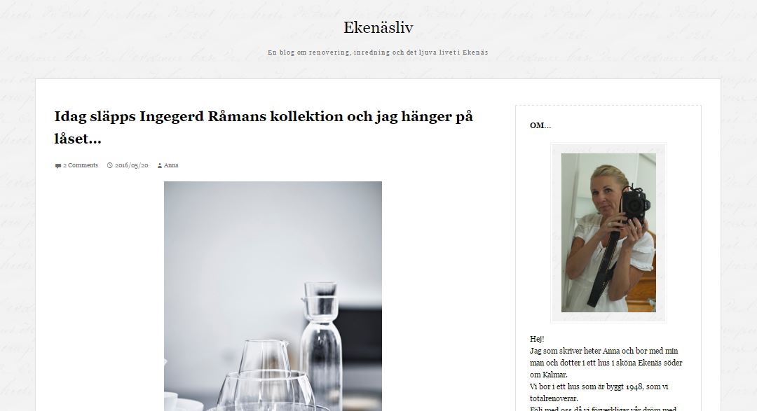 Ekenäsliv levs i ett hus från 1948 som totalrenoveras. Huset blir vitt och det har byggts till glasveranda och entré, fönster har bytts ut till fönster med spröjs, karaktären går mot ett äldre hus. Fantastiskt många andra projekt är färdigställda, källaren är renoverad, ny el dragen, taket bytt, nytt kök, nytt garage och tvättstuga för att bara nämna några som vi kan kan kika på som inlägg med bilder. Nu drömmer familjen om en altan och att renovera mer inne i huset, något säger oss att det inte kommer att dröja länge. Kategorier bland andra är moodboards, blommor, belysning, duschrum och så .... Dalarna..... som berättar för oss att Annas blogg inte bara handlar om inredning och renovering utan också är en livstilsblogg en blogg att följa över tid.