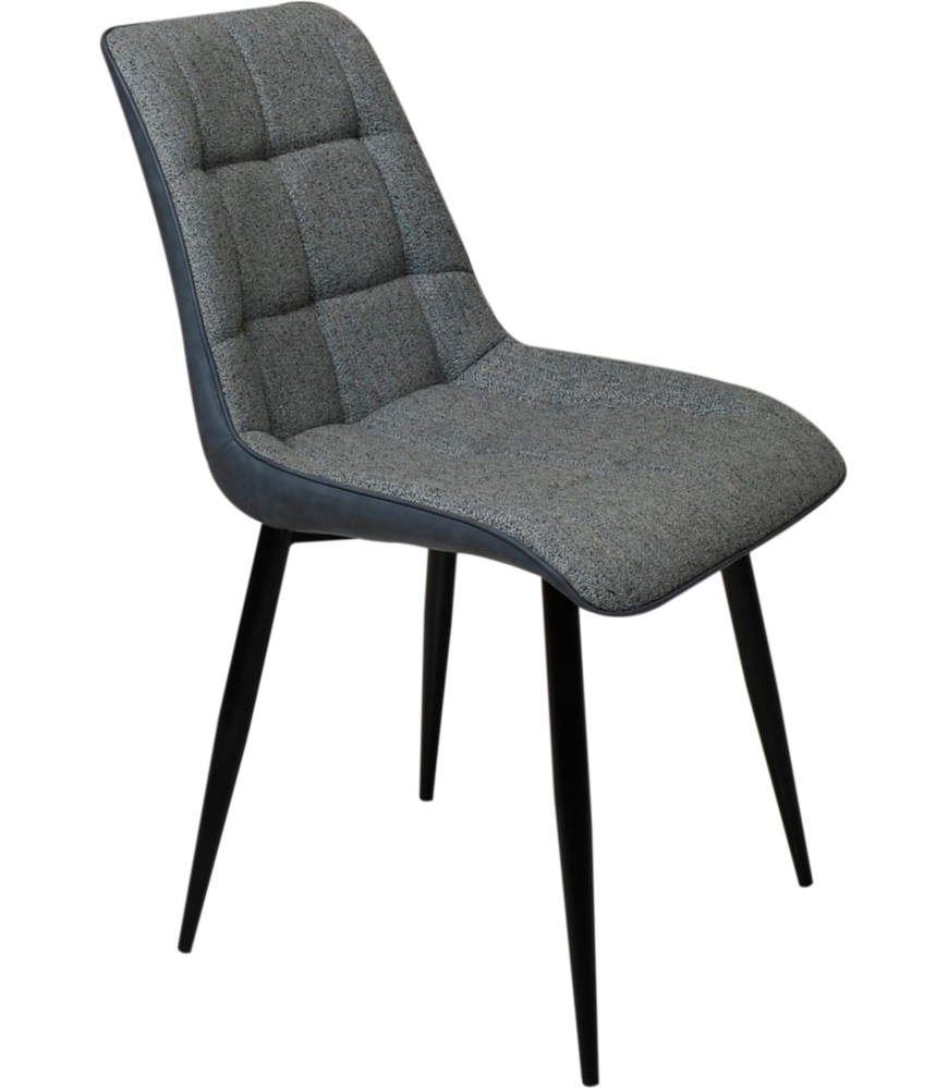 Stol med ordentlig stoppning och mönster i stolsryggen. Underrede av svart metall och sits samt rygg i grått tyg. Baksidan av stolen är klädd med gråblått PU.