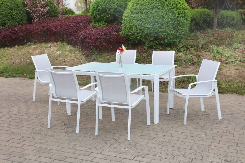 Modern matgrupp med stomme i vit väderbeständig aluminium och beige tyg i stolarna. Stolarna är stapelbara. Bordsskivan är av 6 mm matt ljusgrå härdat glas. Matgruppen finns även i antracit.