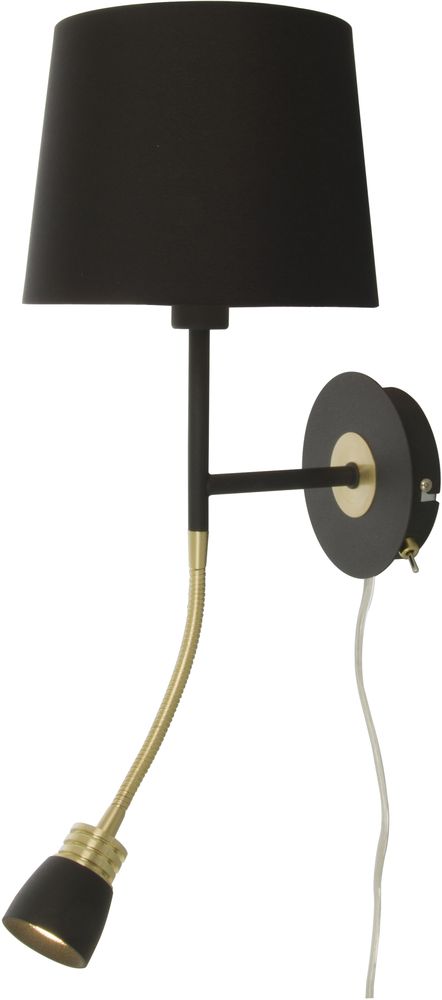 Vägglampa med svart och mässing utförande. Designad med både vanlig vägglampa med skärm, och en LED spotlight undertill som är justerbar. Strömbrytare på plattan. Monteras lätt på väggen.