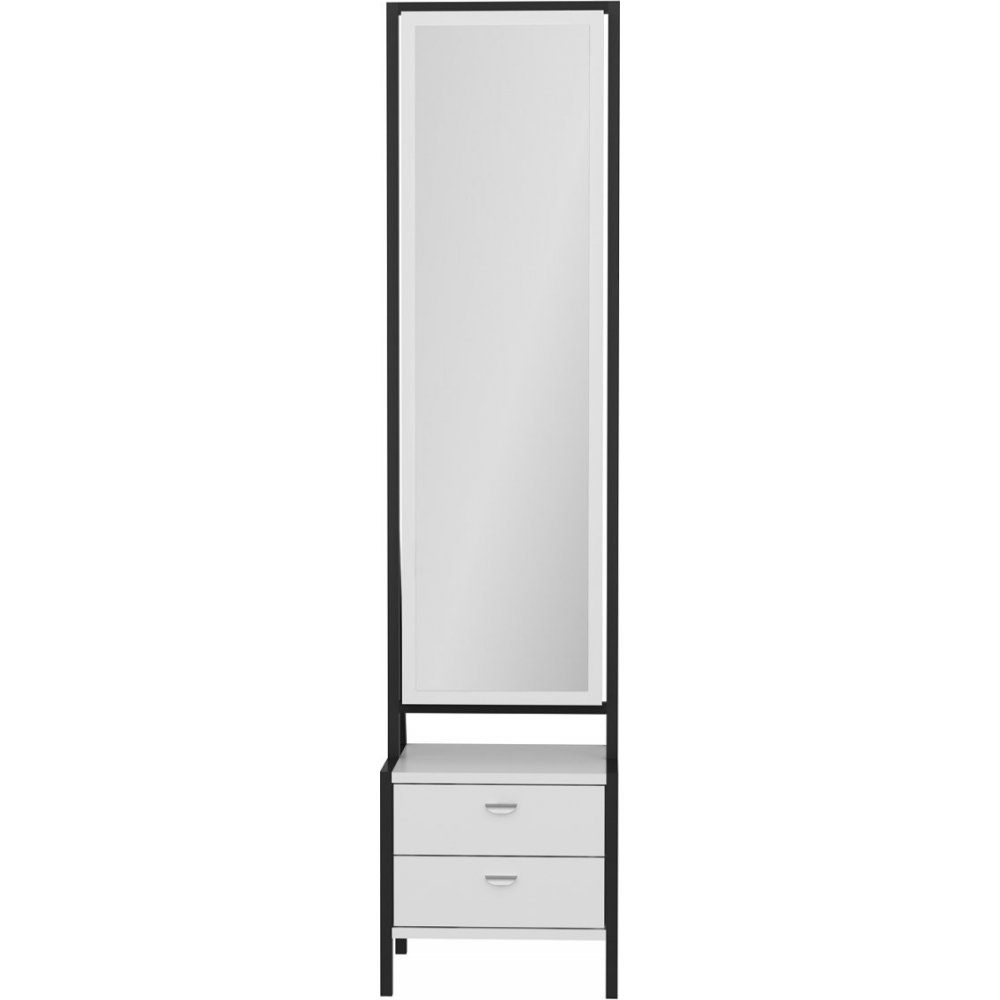 Helkroppspegel med utdragbara förvaringslådor. Ram och lådor av melaminbelagd spånskiva. Spegel av glas.