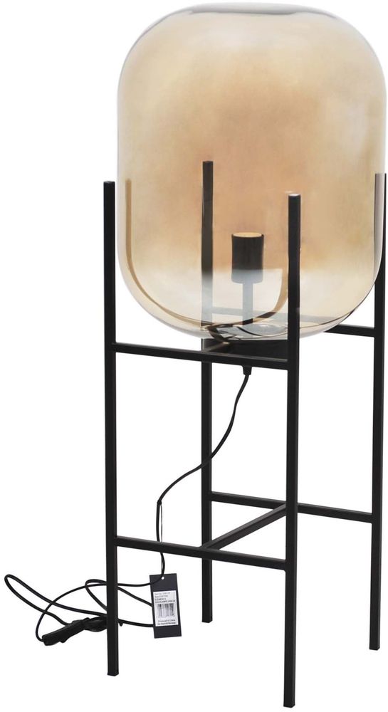 En stilren golvlampa med retro design. Foten är tillverkad av svart metall och kupan är av klarglas. Strömbrytare på sladden.