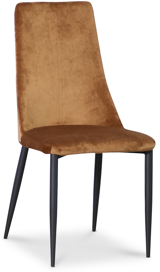 Modern matstol i guldig sammet med svarta pulverlackerade ben i metall.