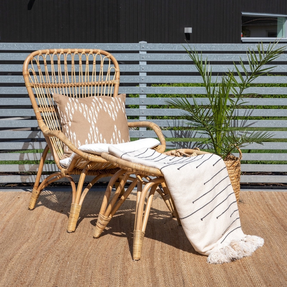 En härlig loungestol från serien Ella som du kommer vilja spendera många timmar i. En bekväm stol i naturfärgad bambu med tillhörande vit dyna. Sitt bekvämt och känn lugnet i hela kroppen - harmoni! Skötselråd: Bambu är ett naturmaterial som är otrolig snyggt och trendigt, däremot inte särskilt väderbeständigt. Rottingmöbler ska helst inte stå utomhus utan bör placeras i torra utrymmen. Undvik stora temperaturskillnader. Enklaste rengöringen sker med fuktig trasa.