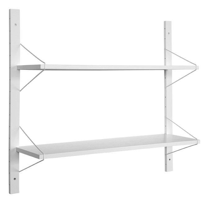 Elma är en Hyllserie som har blandat retrodesign från 60-talet med dagens stilrena design. Vitlackade hyllplan och konsoller.
