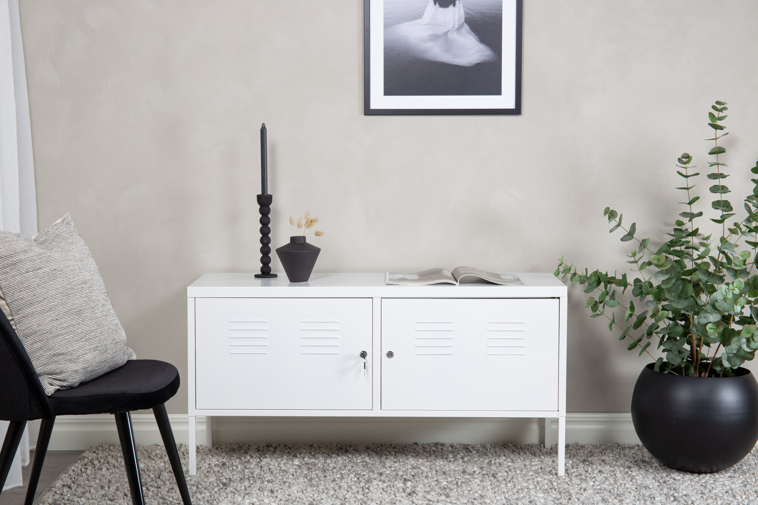 Skåp i vitlackad plåt med låsbara dörrar. Skänk, förvaringsskåp eller tv-bänk, användningsområdena är många.