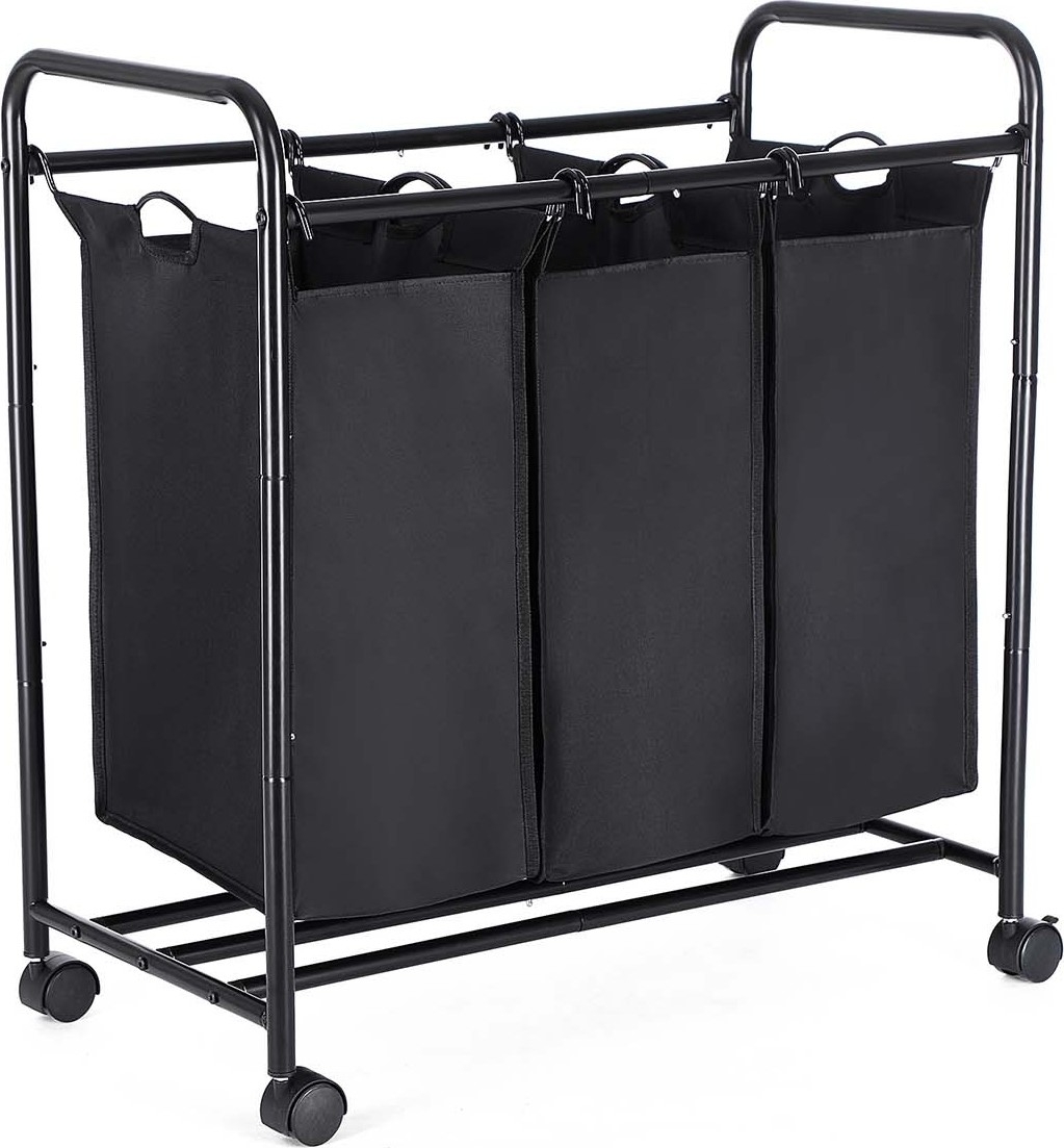 Vagn av stål med 3 separata tvättkorgar av polyester. Varje korg rymmer 44 liter.
