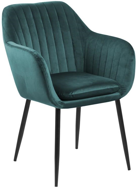 Karmstol med en klassisk profil. Klädd i grönt sammetstyg och med i svart pulverlackad metall. Stolen ingår i vår Emilia serie.