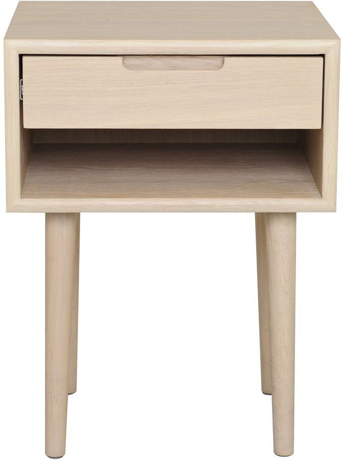 Sängbord i lackad ekfaner med massiva runda ben av ekträ. Sängbordet är lackat men finns även i en variant med svartlackad ekfaner.