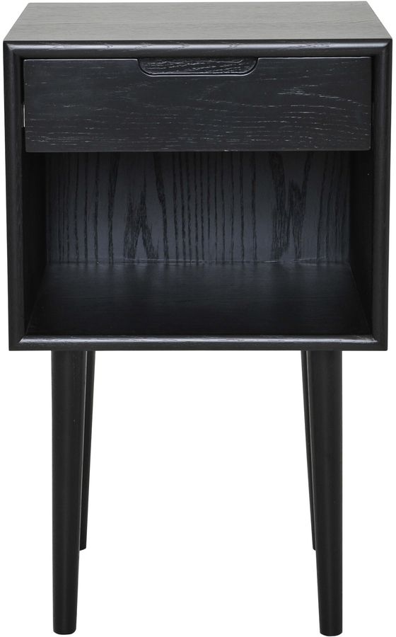 Sängbord i lackad ekfaner med massiva runda ben av ekträ. Sängbordet är svartlackat men finns även i en variant med vitpigmenterad ekfaner.