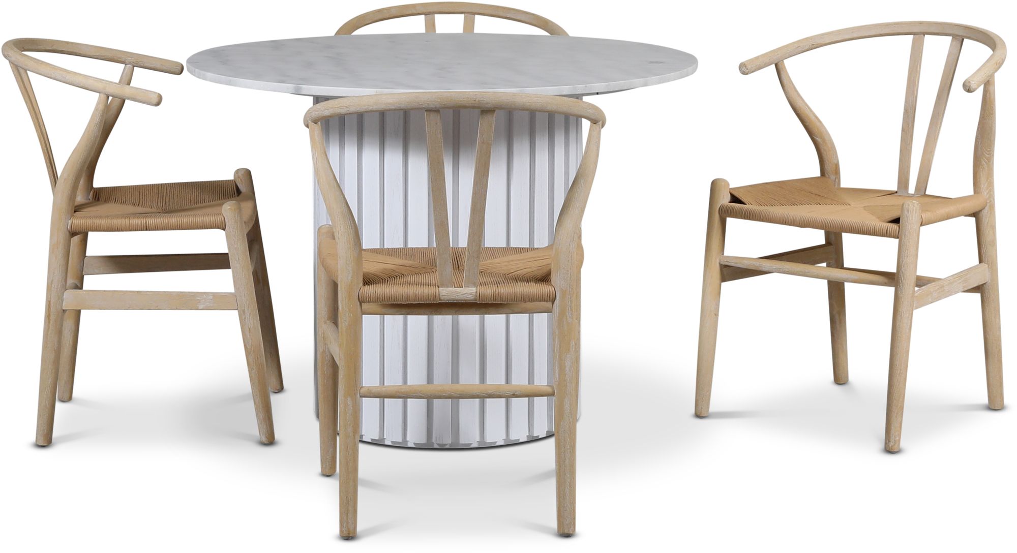 Empire matgrupp Ø105 cm inkl. 4 st Brandon matstolar whitewash - Ljus marmor / Vit lamell träfot