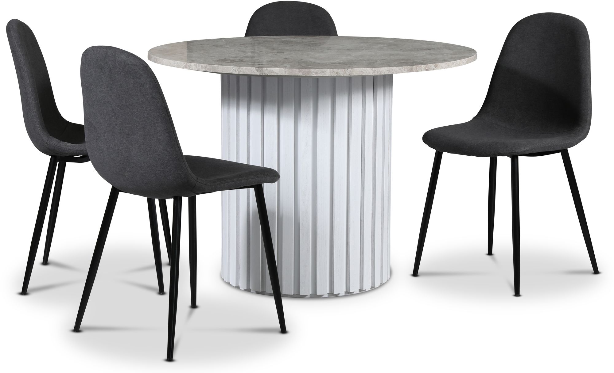 Empire matgrupp Ø105 cm inkl. 4 st Carisma mörkgrå stolar - Silver Diana marmor / Vit lamell träfot