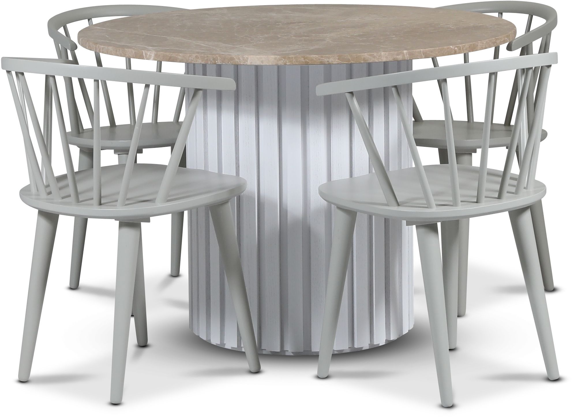 Empire matgrupp Ø105 cm inkl. 4 st Dalsland grå karmstolar - Empradore marmor / Vit lamell träfot