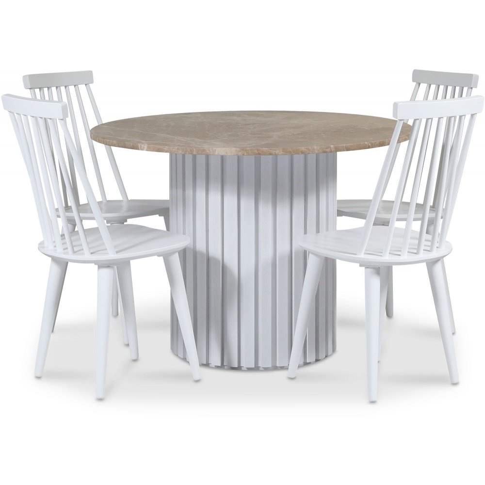 Empire matgrupp Ø105 cm inkl. 4 st Dalsland vita pinnstolar - Empradore marmor / Vit lamell träfot